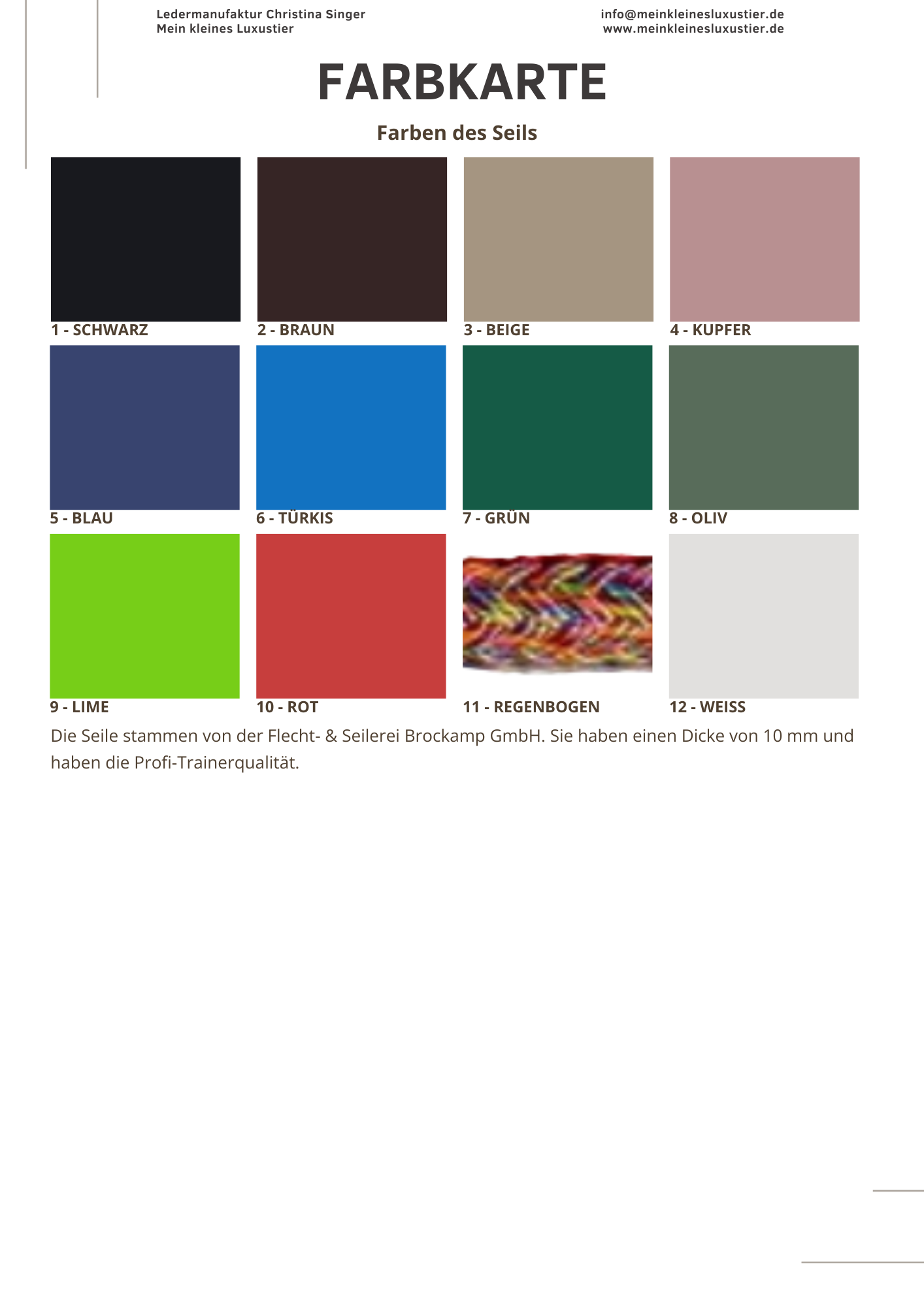 - Persönlicher Kontakt: Nach deiner Bestellung melde ich mich innerhalb von 1-2 Werktagen, um mit dir die Details zu klären (Farbauswahl des Leders und des Seils, exakte Länge deiner Zügel).